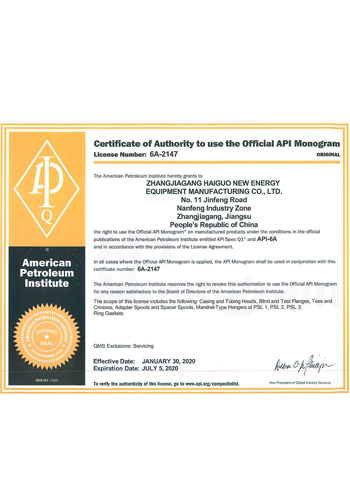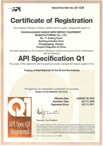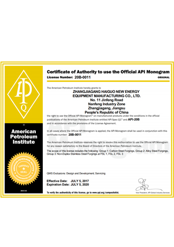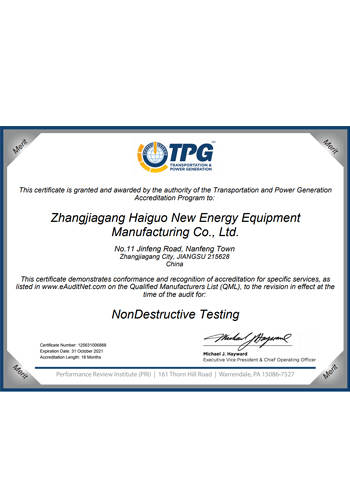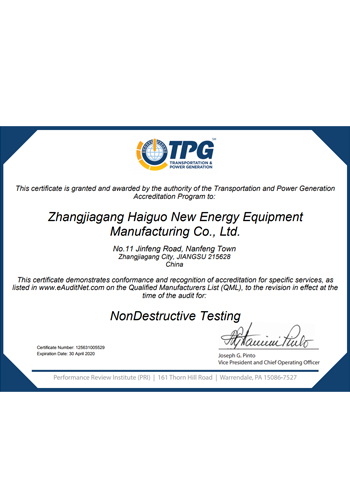 - 公司取得了美國ABS、法國BV、中國CCS、挪威DNVGL、韓國KR、英國LR、日本NK、意大利RINA等全球八大船級社的工廠認證證書,建立了完善的產品質量管理體系。先后獲得了美國API20B資質證書、API6A資質證書、APIQ1體系證書、TPG的NDT認證證書、TPG 熱處理認證證書、歐盟PED等認證證書,同時也通過了一些國際客戶具有高度專業要求的資格認證。
